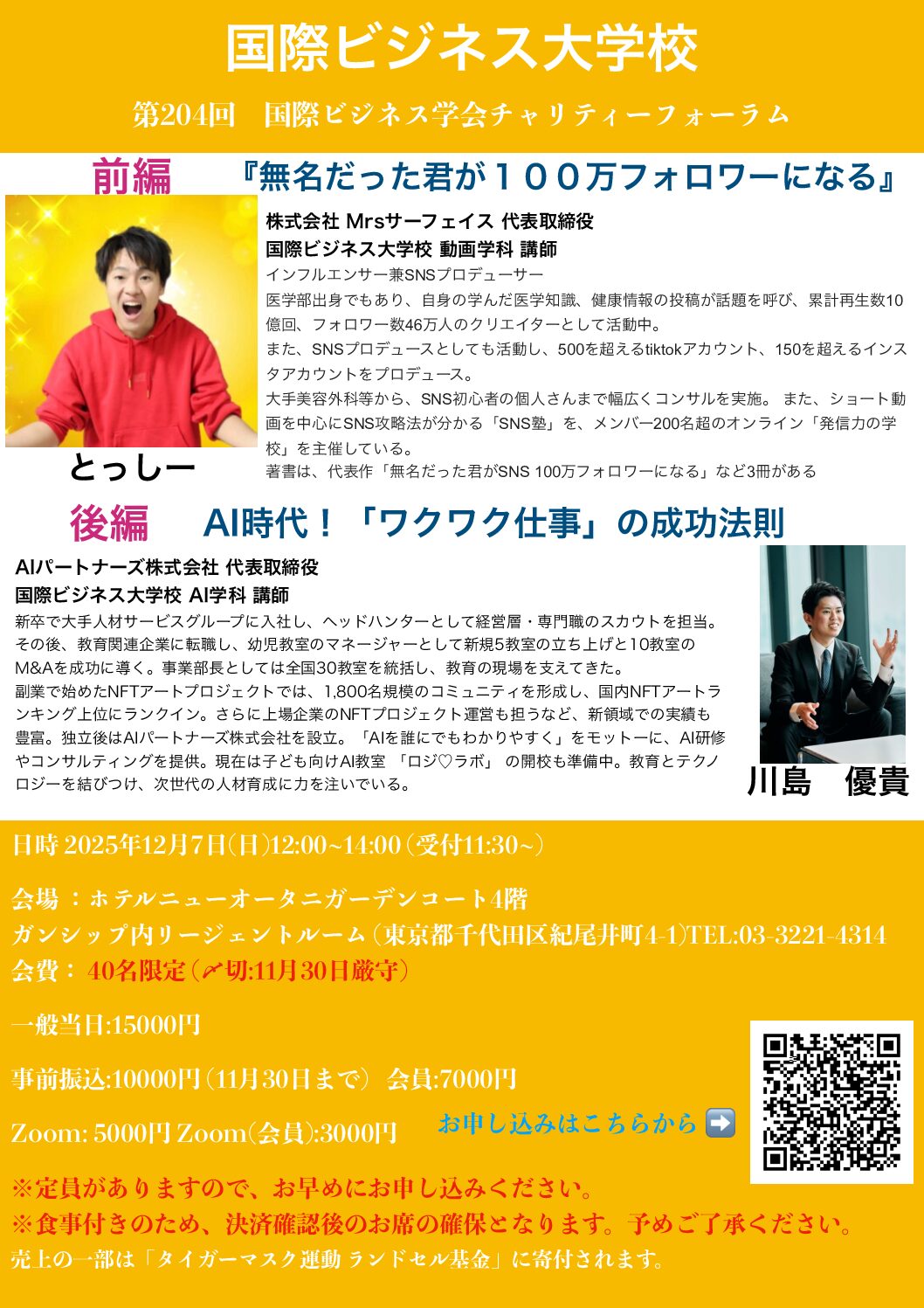 イベント情報 / ニュースリリース 【2025年12月7日 国際ビジネス学会チャリティーフォーラム開催のお知らせ 講演者:川島 優貴 氏 とっしー 氏】 🌟 第204回 国際ビジネス学会チャリティー …